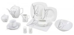 Doskonały pomysł na prezent na ślub lub uroczystą rocznicę ślubu. Srebrzysty rysunek ożywiony małym akcentem w kolorze różowym dodaje osobliwego uroku kwadratowej porcelanie.